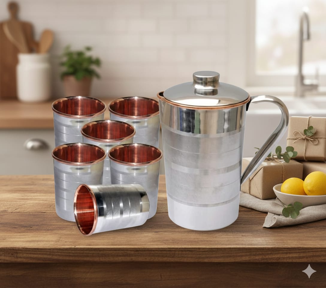 This elegant Pure Copper Water Jar with Matching Glass is designed to store drinking water in the traditional Ayurvedic way. When water is stored overnight in copper, it becomes naturally energized, helping balance the body’s doshas while enhancing immunity and digestion. A perfect blend of ancient wisdom and modern design, ideal for home, office, or gifting.